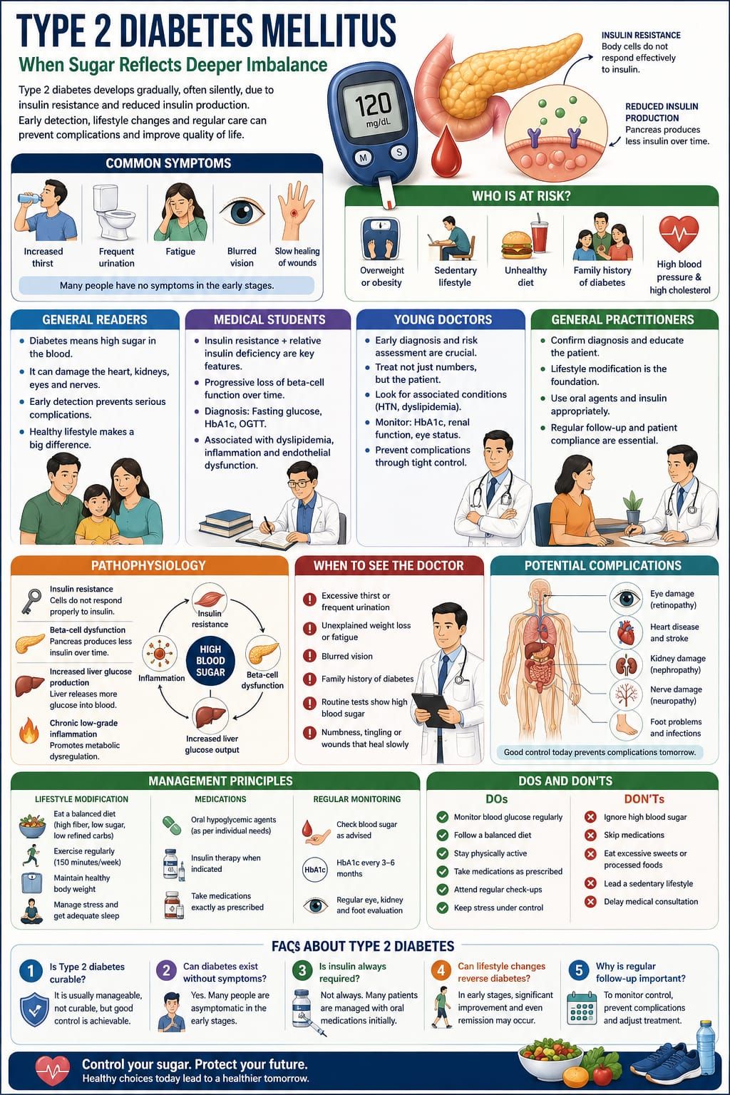 Type 2 Diabetes Mellitus is no longer merely a metabolic disorder—it is a reflection of a broader imbalance within the body. It develops gradually, often silently, and becomes evident only when its effects begin to interfere with normal physiology.